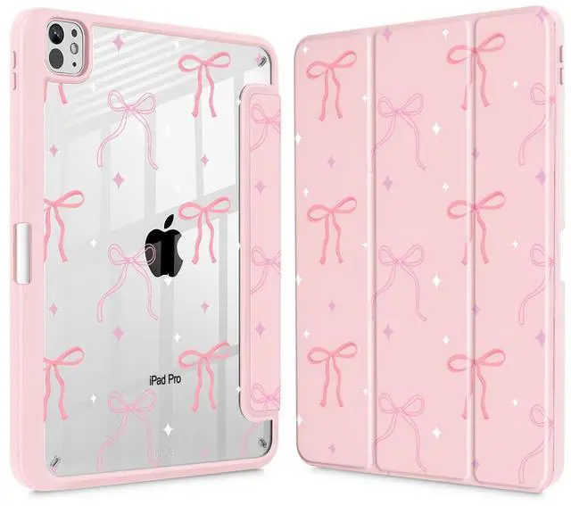 Tuiklol for iPad Pro 11 Inch (M5 2025 / M4 2024) Case, Buit-in Pencil Holder with Slim Clear Back Cover Protection Trifold Stand-Auto Wake/Sleep Tablet Case, Black Flower Pink Bows