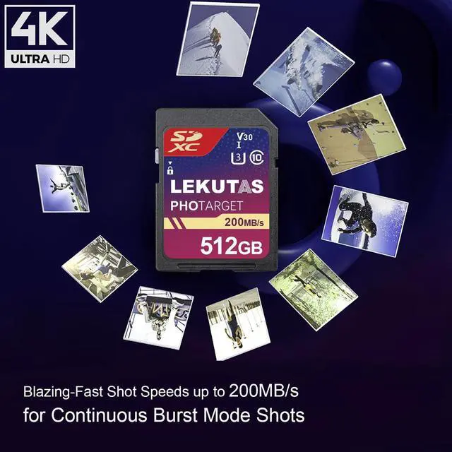 Non-Stop Shooting and Transfers in a Blink Read speed up to 200MB/s and write speed up to 130MB/s. Spend less time transfering means more time creating. You will NEVER miss a shot. ^^ Perfect for Shooting 4K UHD Video Features U3 and V30 ratings with A2 performance that helps with fast loading and 4K UHD video capture and sequential burst mode photography. (Full HD (1920x1080) and 4K UHD (3840 x 2160) video support vary based upon host device. ^^ Adapts To Wide Range of Needs Whether using DSLR, Mirrorless Camera or PC, count on the LEKUTAS SDXC card for extensive compatibility.