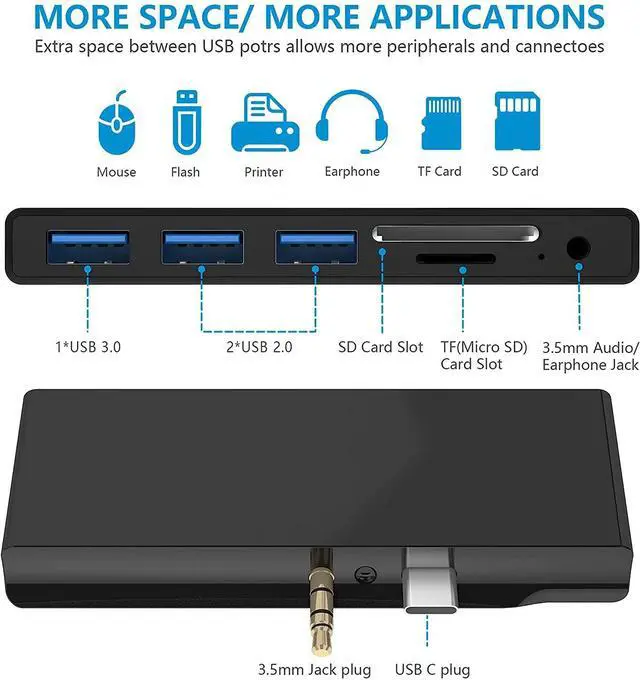 Multiport Surface Go / Surface Go 2 /Surface Go 3 HubEasily extend one USB C port and one Audio port to 1xUSB 3.0 + 2xUSB 2.0 ports, 3.5 mm Headphone Jack, SD/TF Card Reader, without install drive, plug and play. Specially designed for Microsoft Surface Go / Surface Go 2 /Surface