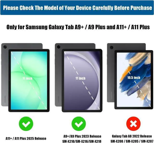 Compatibility: Samsung Galaxy Tab A11+ / A11 Plus Model (SM-X310/SM-X315 LTE/SM-X236) 2025 Release tablet; A9+ / A9 Plus Model (SM-X210/X216/X218) 2023 Release tablet; Not compatible with any other devices. (Please visit TUOLISG to choose the correct case for your tablet. )
