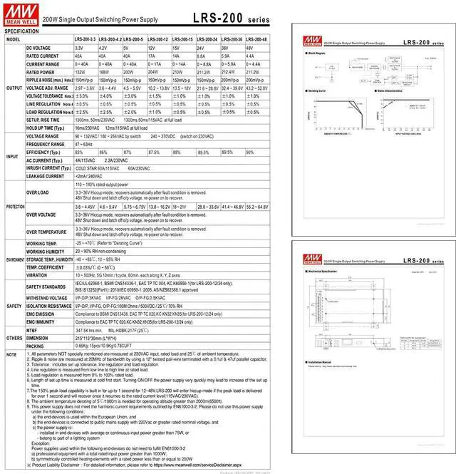 The LRS-200 series epitomizes durable and efficient power solutions, offering versatile outputs from 3.3V to 48V for industrial applications. With an 83% efficiency, the units keep cool operations through natural air cooling in a 1U low-profile metal housing. It provides input voltage flexibility (90-264VAC) and can handle 300VAC surges for 5s. LRS-200 models are engineered with over-temp, overload, short-circuit, and over-voltage protections to ensure safety and dependability under challenging conditions, including altitudes up to 5000 meters.