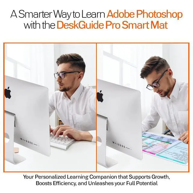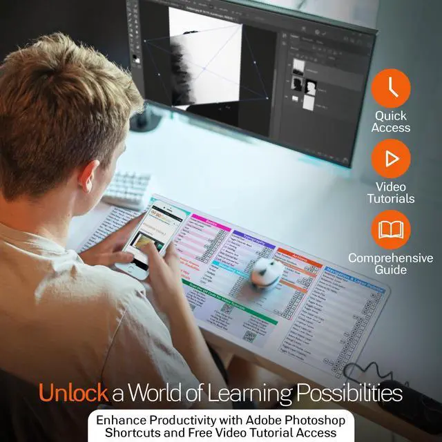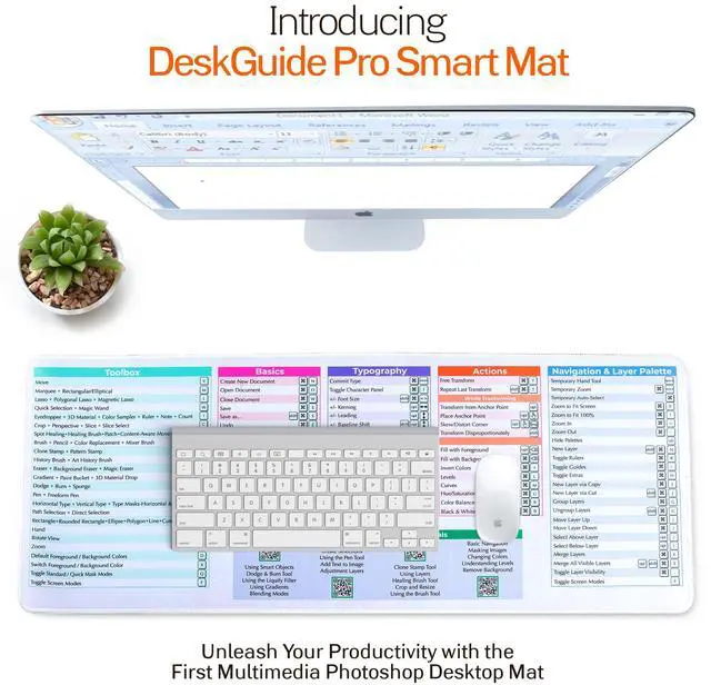 Edit Smarter and Faster - DeskGuide Pro Windows shortcut mouse pad features essential Photoshop shortcuts, streamlining your workflow. No more digging through menus or searching online just grab your mouse and start creating your masterpiece. ^^ QR Codes for Photoshop Mastery - Boost your editing efficiency with our keyboard mat with shortcuts. It packs essential shortcuts and video tutorials (via QR code) for Photoshop toolbox, navigation, actions, and more. ^^ Find What You Need in a Flash - This Photoshop desk mat features color-coded sections and clear text for effortless navigation.