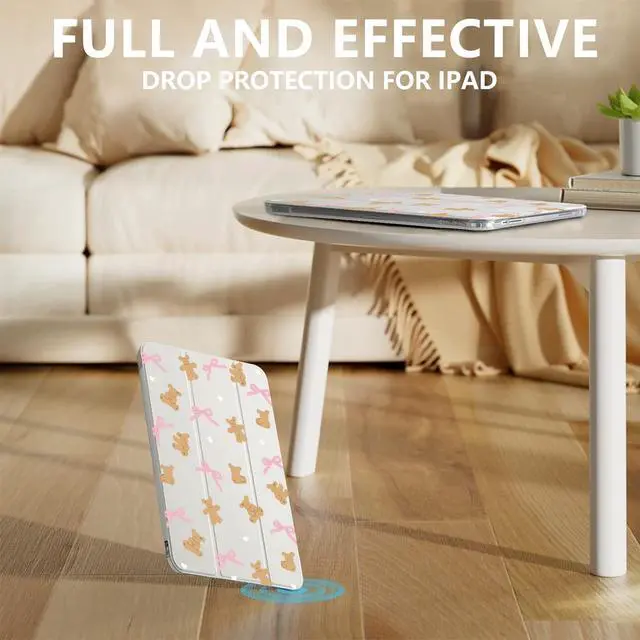 Protection: This cute cartoon printed case for ipad is made of two materials. The comfortable and soft silicone and high-quality durable TPU material provide a comfortable touch for the pad. The back of this lovely pink bows bear case for ipad is made of soft TPU, which provides full body protection and is more durable than traditional silicone materials. It is less prone to yellowing, prevents scratches, and maximizes the protection of your pad from damage and scratchesAuto Wake/sleepBuilt-in magnetic strip, our lovely pink bows bear case for ipad can automatically wakes or puts your tablet to sleep when the lid is opened and closed, protecting and extending battery life; precise cutout also completely supports newest touch ID key function. Built in pen holder ensures the safety of your pencil. Adjustable angleThe trifold stand shell design of this cute cartoon printed case forapple ipad can easily change the angle to meet your viewing and typing needs. This lovely watercolor case for ipad can be folded into a stable triangle, firmly supporting your pad. Whether it's work, study, or watching movies, they can meet your needsPerfect