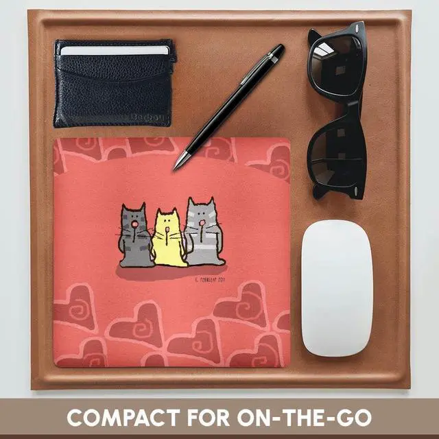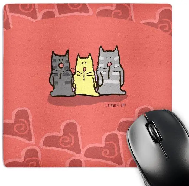 Valentine, 3 Cats and Hearts, Cute Cats, Happy Valentines Day Mouse Pad is 8" x 8" x. 25" and is made of heavy-duty recycled rubber. Matte finish image will not fade or peel. Machine washable using a mild detergent and air dry.