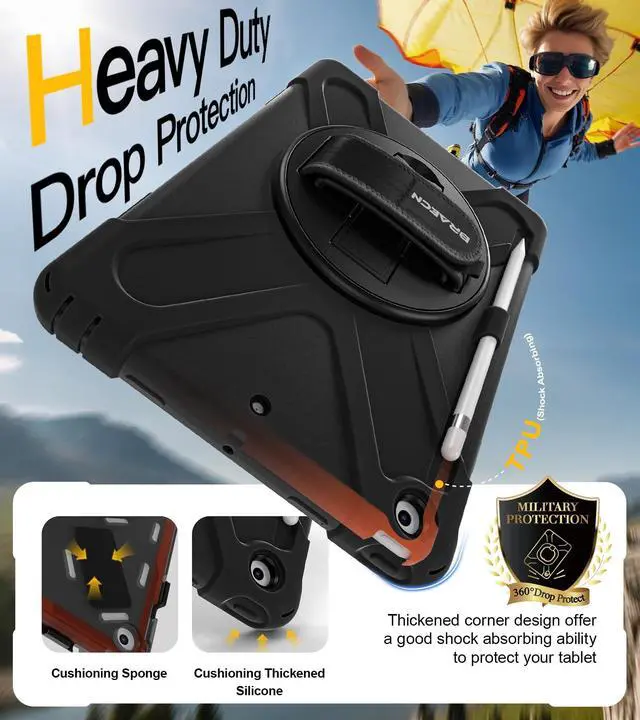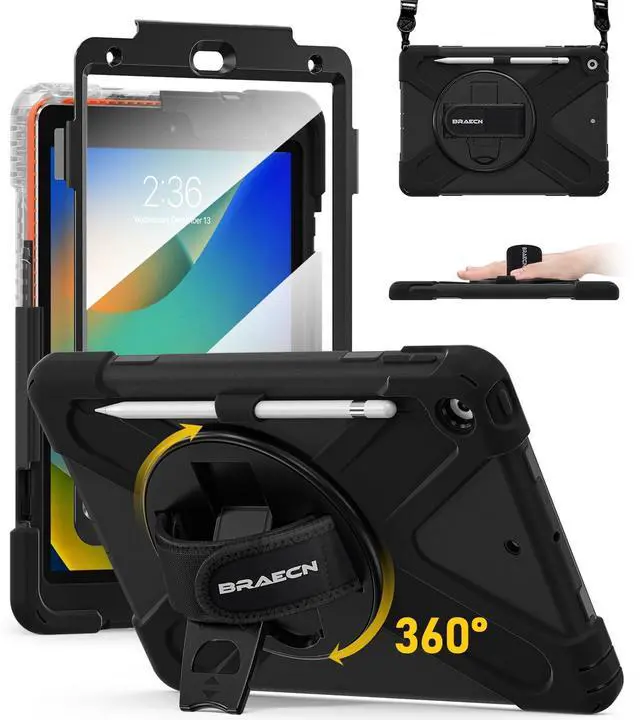Compatibility Only fit for Apple iPad 9th/8th/7th Generation 10.2 Inch 2021/2022/2019 [MODELA2602/A2603/ A2604/A2605/A2270/A2428/A2429/A2430/A2197/A2198/A2199/A2200], WILL NOT FIT ANY OTHER MODEL. Pencil Cap Holder is included, but Apple Pencil is not included. ^^ Full Body Protection iPad 9th Gen Case with Three layer structure design with built-in transparent screen protector provides a full around protection against scratch, impacts and shock during daily use. Built-in Apple Pencil Holder and Apple Pencil Cap Holder offer a safe way to store your iPad Pencil while using our case. ^^ 360 Swiveling Stand & Hand StrapLocated on the back of apple iPad 9th/8th generation 10.2 inch case 2021/2020, built-in 360 degree rotating kickstand and adjustable handle hand strap provides a more flexible and convenient way to use your tablet during work, study or journey, ideal for students, teachers, engineers, cashiers and waiters, etc.