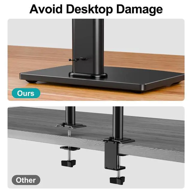 ^^ Avoid desktop damage - this is a free-standing desk monitor stand, no use for drilling any grommet hole or using any clamp, you can keep the monitor upright, perfect for lazy people or those who don't want to destroy your beautiful desk. As it is not fixed to the tabletop, the stand is easy to move. ^^ Comfortable workspace -Say goodbye to messy desktops! This single monitor stand comes with cable management to keep cords clean and organized. It also allows you to move your monitor away from your desktop, freeing up valuable space for other items and making your desk neater and visually more comfortable.