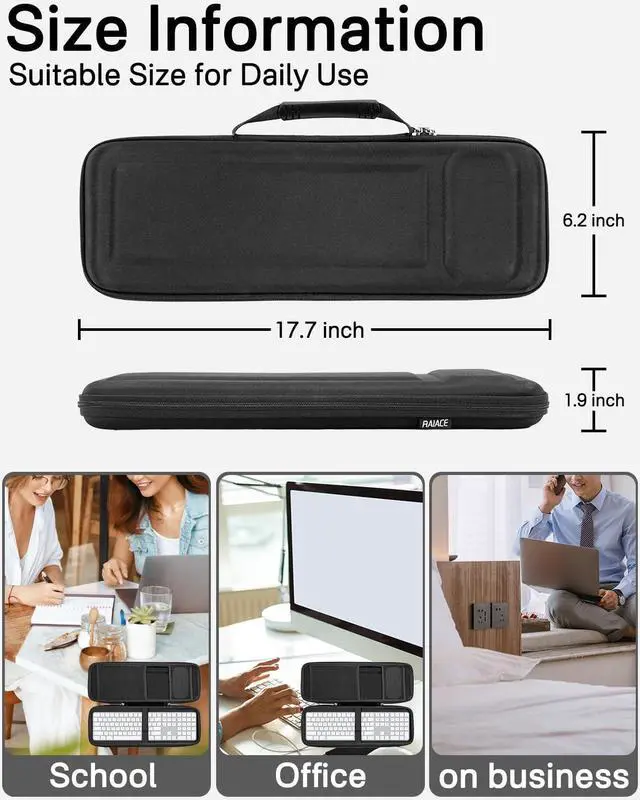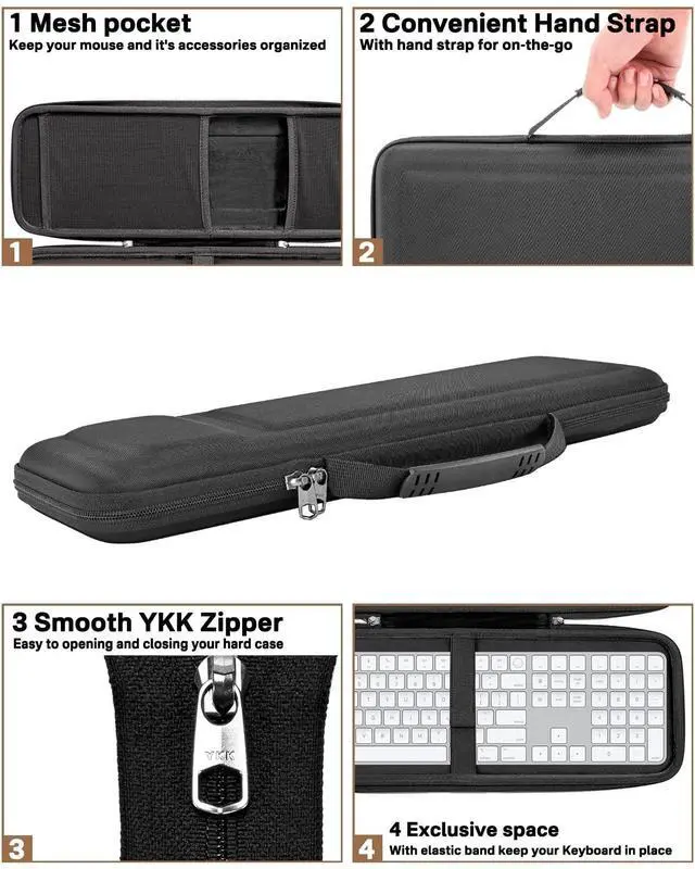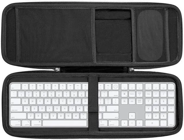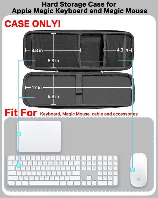 These carrying case act as protective travel cases which compatible with Apple Magic Keyboard + Magic Mouse. Portable design, convenient to carry, for taking your Keyboard and Mouse during traveling or business trip. Here's a quick recap of the benefits: -Our hard case totally tailored for your Apple Magic Keyboard + Magic Mouse, so it fits perfect! Build-in high quality velvet which is an excellent buffer for your precious device! -Semi-waterproof, Shockproof, Stylish and Durable. The case is made of superior Hard EVA for durability, keeps your device safe. -Comes with a steady hand strap to carry easily, mesh pocket will conveniently accommodate the cable and other small accessories.