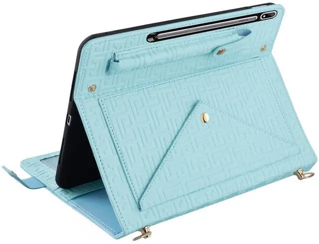 • Pocket and Wallet Design: An envelope pocket external allows you to store your passport and some paper files. A pen case pocket designed for S Pen. Interior with multiple slots for holding