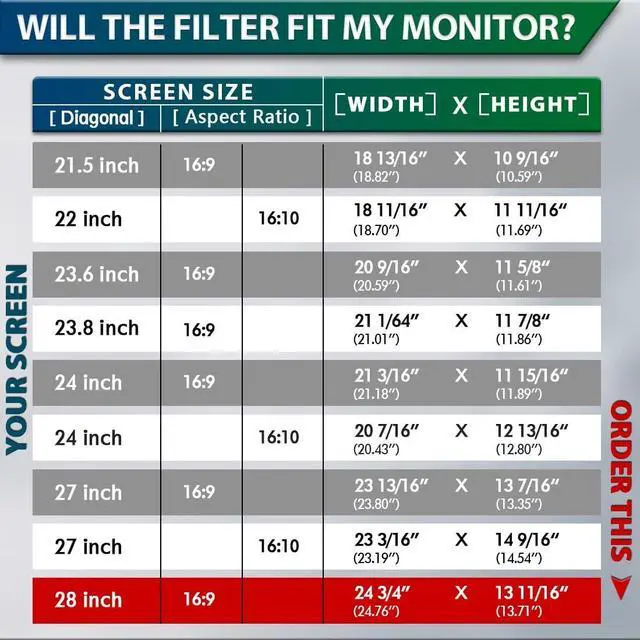 Note: Raised frame monitors NOT fit. ^^ [Upgraded Installation & No Mess] The Stary 28" monitor privacy screen is fully upgraded, eliminating the need for plastic tabs or tape to hold the privacy screen in place. Say goodbye to screens that leave a sticky residue when removed and stop working after a few uses. Our filter will automatically attach to the inactive black area of the display edge smoothly, quickly, and seamlessly. It can stay firmly on the screen and supports take down/on as needed, leaving no sticky residue. ^^ [Superior Privacy and Anti-Glare] Our advanced multi-layered film filter blacks out your computer screen when viewed from the side while maintaining a crystal clear screen straight-on. It also protects your eyes from harmful glare, UV, and blue light.
