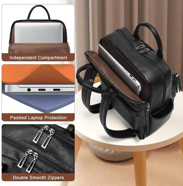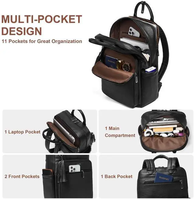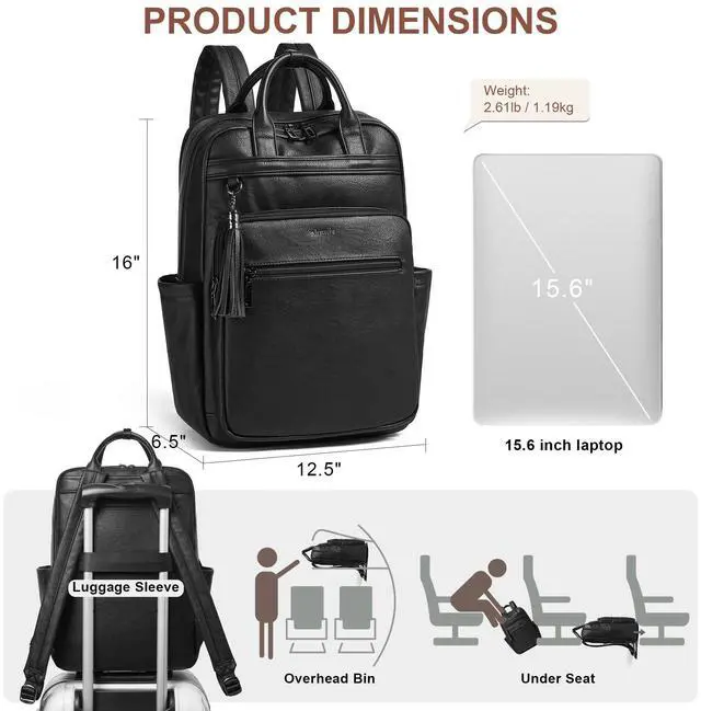 SEPARATE LAPTOP POCKETS - This laptop backpack women has mulit pockets for easy storage: 1 main pocket containing 1 compartment with foam, 1 inner zipper pocket, 2 inner slit pockets; 1 separate laptop pocket (fits 15.6 inch laptop); 2 outer side pockets, 2 front zipper pockets, and 1 back pocket. So you can keep your office documents, cell phone, clothes, etc. in your laptop bag. ^^ LARGE CAPACITY BACKPACK - The leather backpack measures 12 L x 6.5 W x 16 H, 1.85 lb and can easily fit laptops up to 15.6 inches, iPads of all sizes, magazines, Phone, binder, water bottle, umbrella, magazine, pens, wallet and other small items. ^^ HIGH QUALITY MATERIAL - This backpack purse for women is made of high quality vegan leather. Quality hardware and smooth zipper. This waterproof leather laptop backpack can cope with a variety of scenarios, such as light rain and snow, classic and practical. (Due to the backpack is made by leather if you find it has some odor is normal, but you needn't worry about it just put the backpack in a ventilated place for 2-3 days it will be gradually disappeared ^^ MULTI-PURPOSE - This fashion and durable computer backpack for women comes with a laptop compartment, making it more than just a laptop backpack.