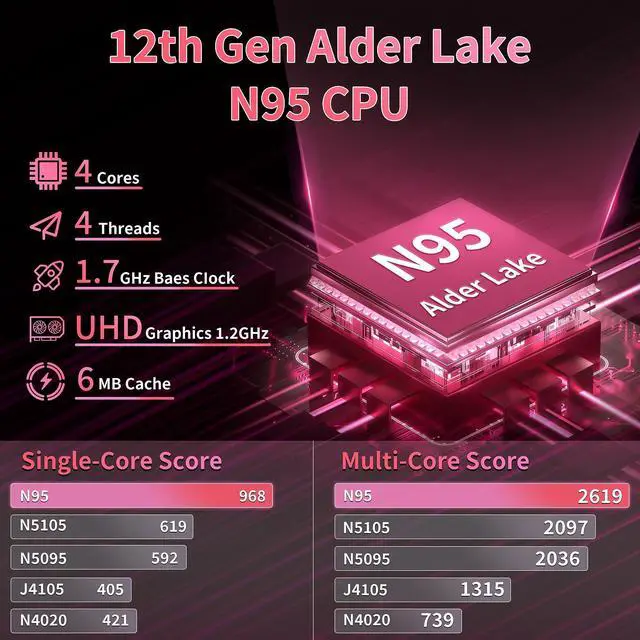 Powerful N95 Quad-Core CPU: Benefit from the lightning-fast performance of the Celeron N95 ultra-fast CPU, clocked at an impressive 1.7GH z- 3.4GH z, alongside UHD Graphics