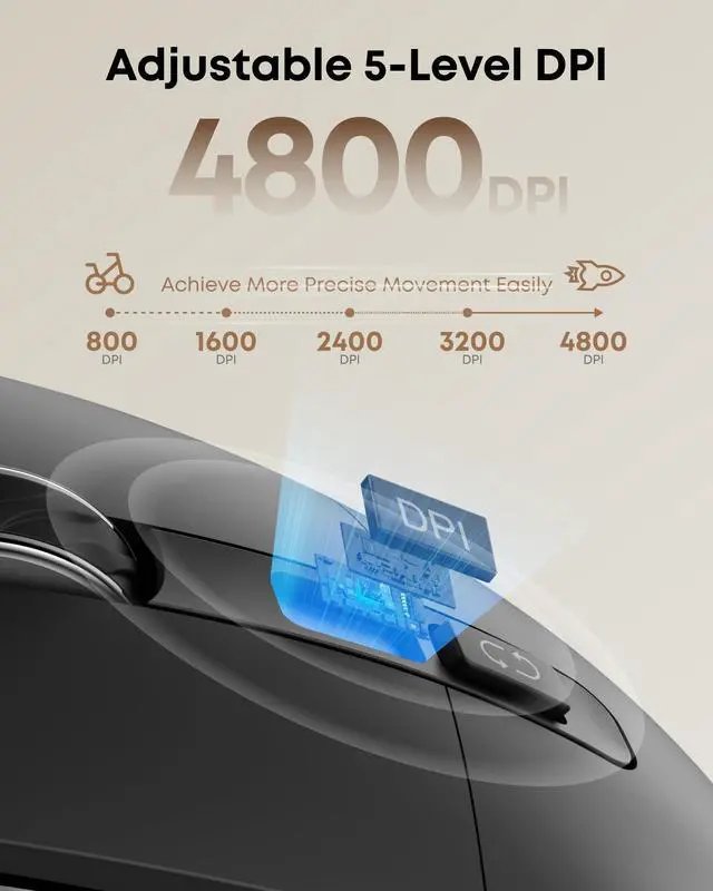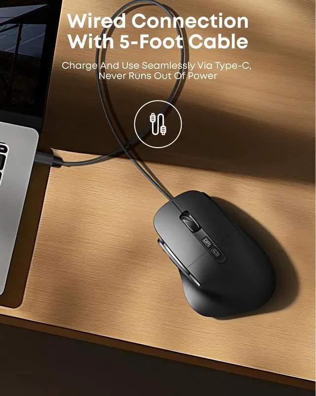 Your Workflow: This wireless mouse seamlessly connect 2 devices (PC via 2.4G USB + phone/tablet via Bluetooth) and switch with one clickno replugging. Computer Mouse Includes a 1.5 m braided USB-C cable for simultaneous charging & using, ensuring nonstop productivity during crunch time. Ideal for workers who multi-task on multiple devices at the same time. ^^ Ergonomic Comfort45Natural Grip, 50% Less Strain! Designed to fit the natural shape of your hand, this ergonomic mouse effectively reduces wrist pressure. This carpal tunnel mouse is perfect for long-hour workers and carpal tunnel sufferers, it relieves discomfort and pain, letting you dominate spreadsheets, games, or creative projects without fatigue. ^^ 5-Level DPI ControlPrecision Meets Speed! 5 adjustable DPI settings of this vertical mouse (800/1600/2400/3200/4800) to flexibly meet your needs. 4800 DPI conquers 4K displays and fast-paced games, while 800 DPI delivers scalpel-like accuracy for graphic design. Switch seamlessly between work, play, and creative missions with zero lag. ^^ Jiggler & Mouse 2 in 1Stealth Mode in 3 Seconds! Simply press and hold the LED button for 3 seconds to enable the "Fool Around" feature.