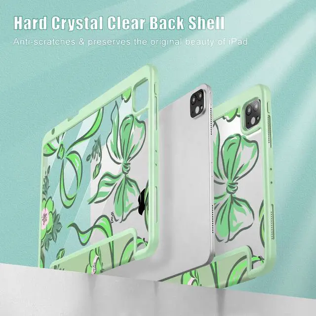 Mektron Case for iPad Pro 11 inch (4th, 3rd, 2nd & 1st Gen) 2022 2021 2020 2018, Buit in Pencil Holder with Shockproof Cover Clear Shell + Auto Wake/Sleep, Flowers-Bows-Green