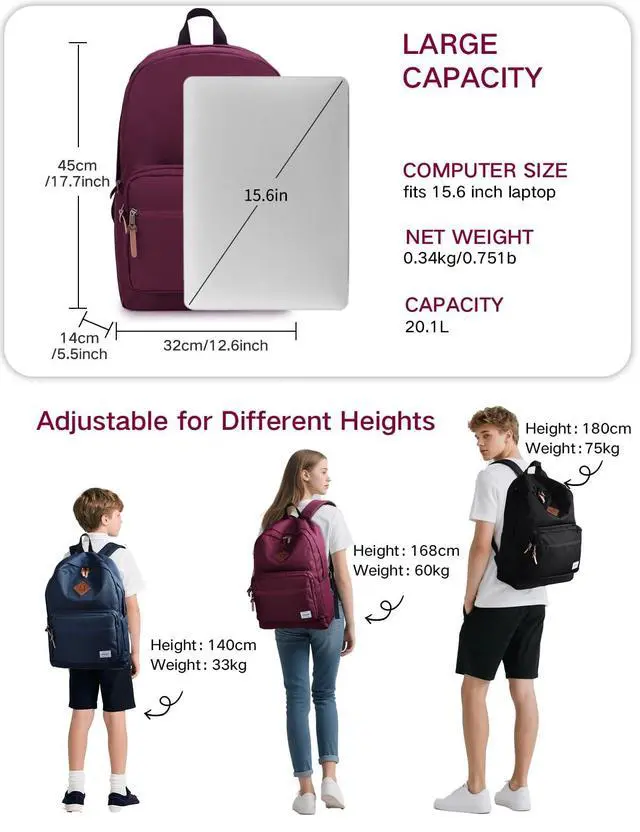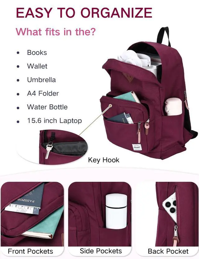 ^^ EASY TO ORGANIZE: Classic backpack features 10 pockets that fits all of the stuffs you need. External access to 2 front zipper pockets, 2 side pockets for water bottle, 1 anti theft back zipper pocket for wallet, Internal access to 1 main zipper compartment includes 1 padded laptop compartment fits 15.6 inch laptop, 2 slip pockets and 3 zipper pockets keep all your things organized and easy to access.