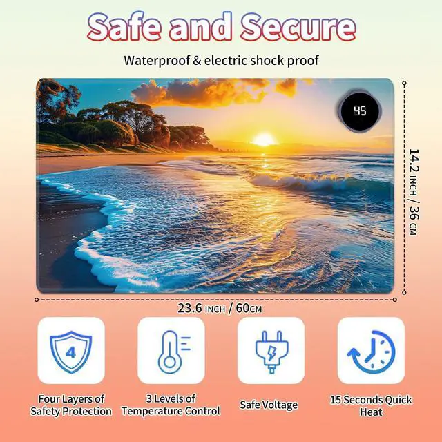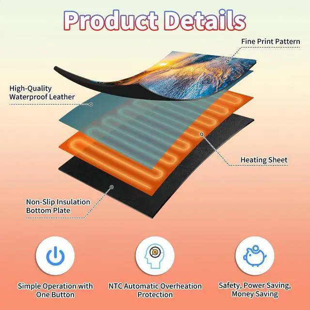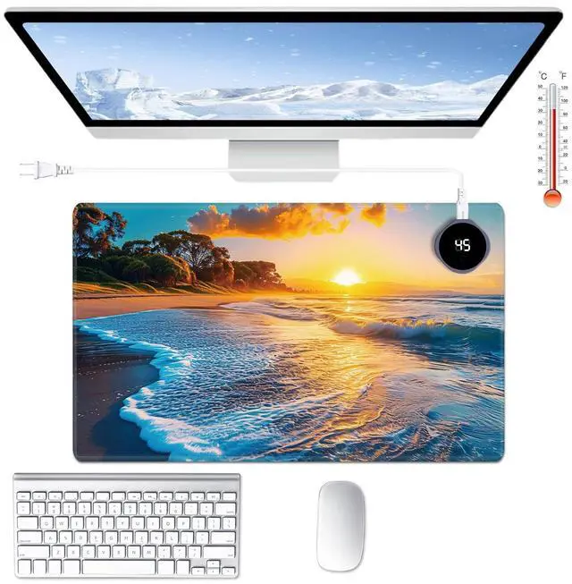 Are You Tired of Having Cold Hands While Working or Gaming? Select BPQOJB Heated Desk Pad is here to keep you warm and comfortable Whether You're Working, studying or gaming, Heated Mouse Pad ensures you stay cozy and productive all winter long Fast Heating with 3 Adjustable Levels Heated Desk Mat with 3 temperature settings: Low (40C / 104F) for gentle warmth Medium (45C / 113F) for consistent comfort High (50C / 122F) for a quick boost of heat Desk Hand Warmer Simple touch control lets you switch between levels effortlessly, You can set it to the right warmth. just seconds, feel the heat and say goodbye to cold hands, wrists, and arms Auto Shut-Off Design Mousepad warmer includes 1, 2, and 4-hour auto shut-off timers. Long-press the power button until it flashes to activate. helping you save energy Durable Material Crafted from smooth PU leather, Gaming Mouse Pad Warmer features a waterproof and easy-to-clean surface Heated Desk Mat Non-slip base keeps it securely in place, providing a stable surface for your keyboard, mouse, and laptop Large & Multi-Functional Design Large Mouse Pad at 23.6 x 14.1 x 0.08 inch (60x36x 0.2 cm) is spacious enough for your desk essentials, keeping your workspace neat and organized Warmer Mouse Mat is winter companion, not just for desksuse it as a foot warmer, a cozy pet mat or resting surface. Perfect for home offices and gaming Pattern Printing Design Unique Pattern Printing Heated Desk Pads decorate your study, computer desk, bedroom or office, perfect accessory for any modern office and home BPQOJB Pattern printing desk mat is the best gift for family, friend and yourself