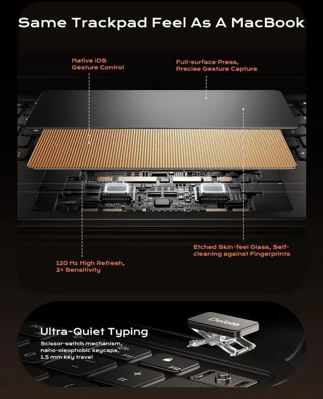 Smart Trackpad & Powerful Suction: Full-glass, full-area touch. 120 Hz refresh, supports native iOS gestures, recognizes multiple gestures easilytwice as sensitive as regular trackpads. Replaces an external mouse and boosts productivity. Custom shortcuts for quick actions like screenshots or volume control. Strong suction backplate keeps your device firmly in place and prevents drops ^^