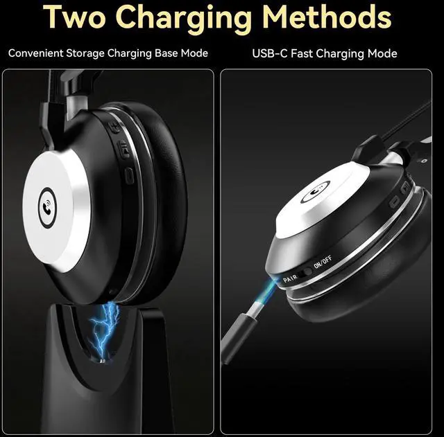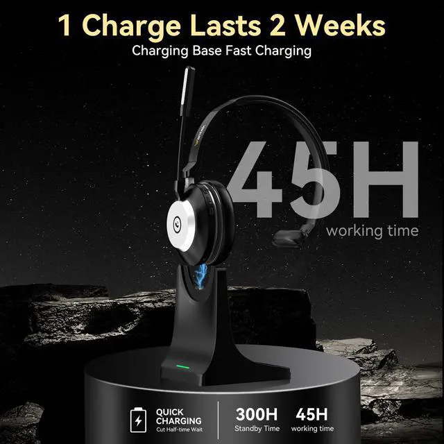 Battery Life: Our wireless headset comes with a strong 500mAh battery, providing an impressive 45 hours of use after a full charge. enjoy long periods of use without needing to recharge often. It only takes 2 hours to fully charge the battery, and we include a charging base for your convenience