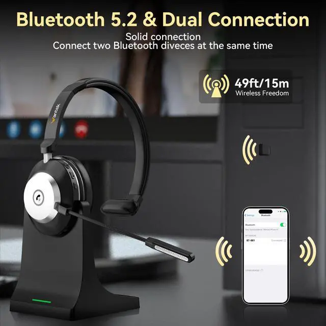 AI Noise Cancellation: Wireless headset with mic for work equipped with AI environmental noise cancelation microphone, it can eliminate up to 99.99 % of the ambient noise, only picks up your voice and block out unwanted background noises ^^ Immersive