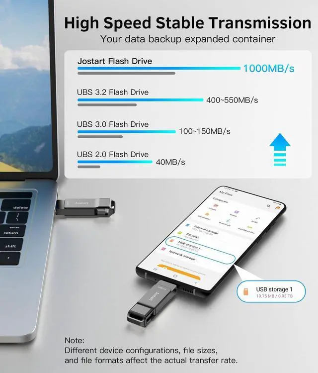 2 in 1 DUAL USB C & USB A FLASH DRIVEJostart Dual Flash Drive with USB-C USB C 3.2 Gen2 port and USB-A port makes it easier to transfer data between your smartphone/tablet and computer. Instantly free up space or quickly transfer pictures or movies on OTG-enabled Android Type C phones, tablets, Mac-Books, Windows computers, car audio systems, smart TVs and more. ^^ ULTRA-FAST TRANSFER SPEEDSThe Jostart USB 3.2 Gen 2 Solid State Flash Drive delivers read and write speeds of up to 1000mb/s, which is up to 20 times faster than traditional USB 3.0 flash drives and memory sticks.
