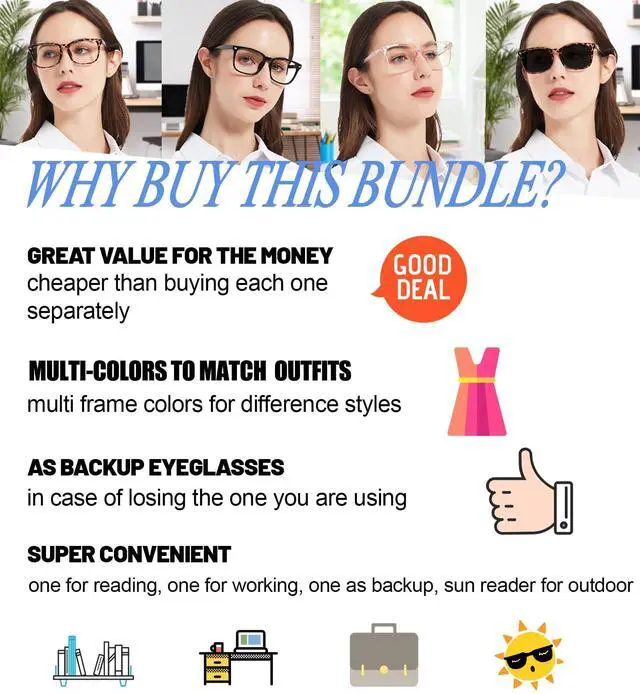 ^^ SAVE MONEY: USE the tiny three-in-one screwdriver to repair your glasses regularly (once every 2 weeks) for a long-term comfortable wearing, durable and not easily damaged. Removable glasses cover and lens films to avoid scratches during mail. The lanyard to hang around your neck to avoid loss and breakage when work breaking, cooking, shopping, walking. ^^ WHAT DO YOU GET - 3* Fashion Blue Light Reading Glasses; 1* Total Reader Sunglasses; 1* Screwdriver; 1* Soft Cloth; 1* Bag.