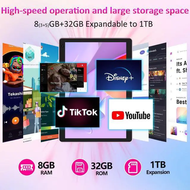 Android 15 Tablet The CP10 Pro ipad tablet is powered by the latest Android 15 OS with AI, ensuring broader app compatibility, faster startup times, and improved responsiveness. The new system provides a more personalized and safer experience, upgraded privacy protection and security. ^^ 8GB RAM+32GB ROM Tablet This 10.1 -inch tablet is equipped with 8GB (3GB fixed memory + 5GB virtual memory) RAM and 32GB ROM of large storage space, supporting a maximum expansion of 1TB (Micro SD Card). Has faster reaction speed and multitasking. The tablet has passed Google's GMS certification, and you can obtain various mainstream applications from the Google Store, such as Twitter, TikTok, Line, Instagram and more.