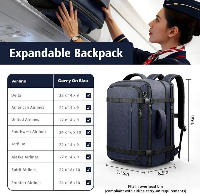 Day Trips: This expandable travel backpack carry-on measures 19 12.5 5.5 inches and fits most airline personal-item guidelines, sliding under many airline seats. Expands to 19 12.5 8.5 inches for 4050L of packing space, ideal for 35 day travel, weekend trips, and carry-on flights. Includes a padded 17.3 inch laptop sleeve and organizer pockets for clothing, shoes, chargers and travel essentials. Lightweighs 2.4 lbs for lightweight travel ^^ 2 180 Lay-Flat Suitcase Opening for