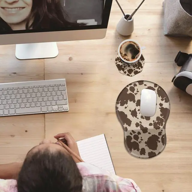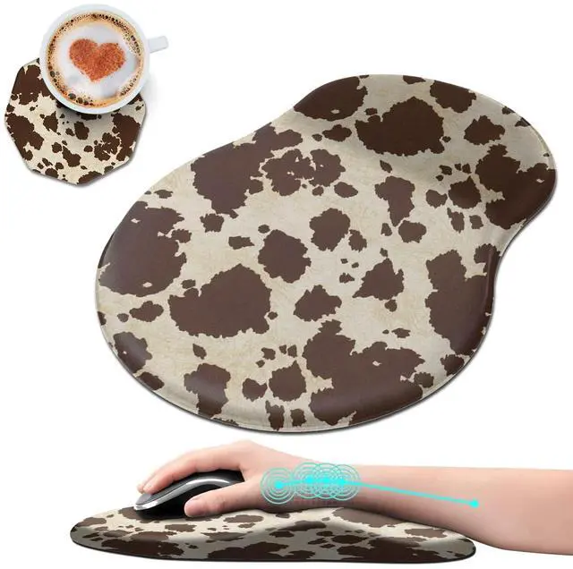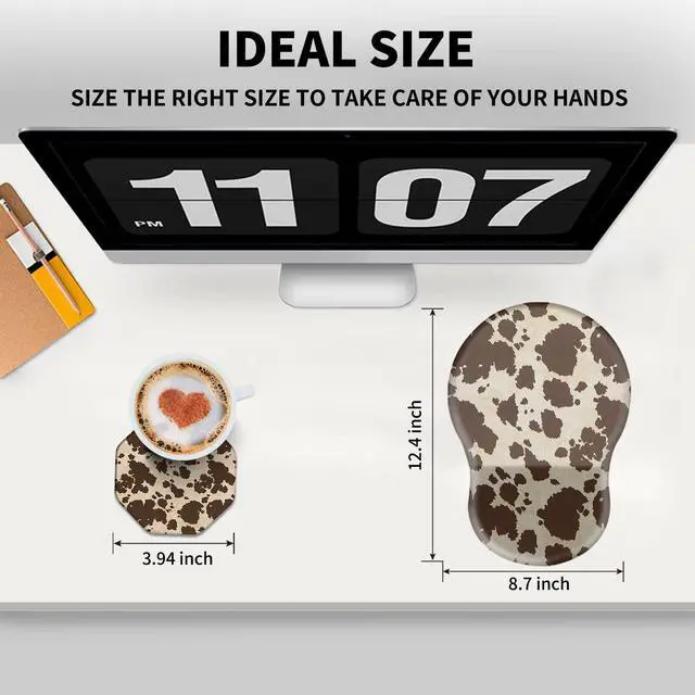 Unique Shape and Size-- 13x 8.66 x 0.86 inches; Coffee Coaster 4" x 4" x 0.08" mouse wrist rest pad fits all types of mouse, wired, wireless, mechanical, laser & optical. The reinforced edges of mousepad prevent deformation and damage to guarantee long term use. High quality materials-- This mouse pad is made of memory foam with no additives or fillers. And the cover is made of soft and smooth fabric, no irritation to skin, is able to track the mouse movements fast and accurate. Not easy to curl up on the edges even after long time usage.