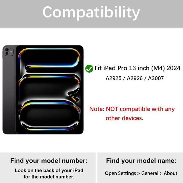 Compatibility- Protective case for Apple iPad Pro 13 inch 2024 (M4). NOT compatible with any other devices. NO pen in package. ^^ Support 3 System&Full Shortcut Keys- The magnetic wireless keyboard can be removed from the case freely. Compatible with iOS, Android, Windows. Just press Fn and corresponding keys (QWE) to change the keyboard system. Hot keys Customized for iPads, Full Shortcut Keys give you a more efficient way to use your keyboard. ^^ Long Life Battery&Rechargeable Slim Bluetooth Wireless Keyboard&Instant pairing- 2-3 hours full charge, work for more than 80 hours, stand by for 130 days.