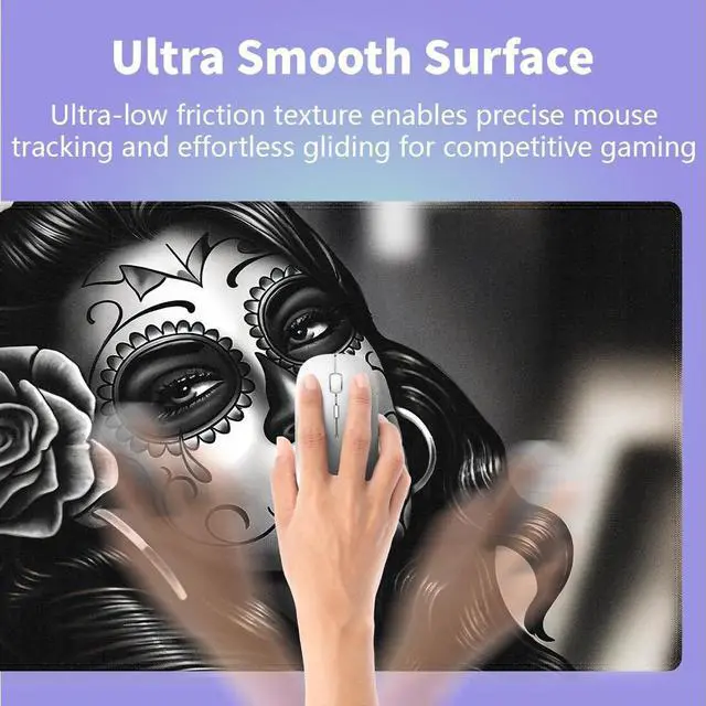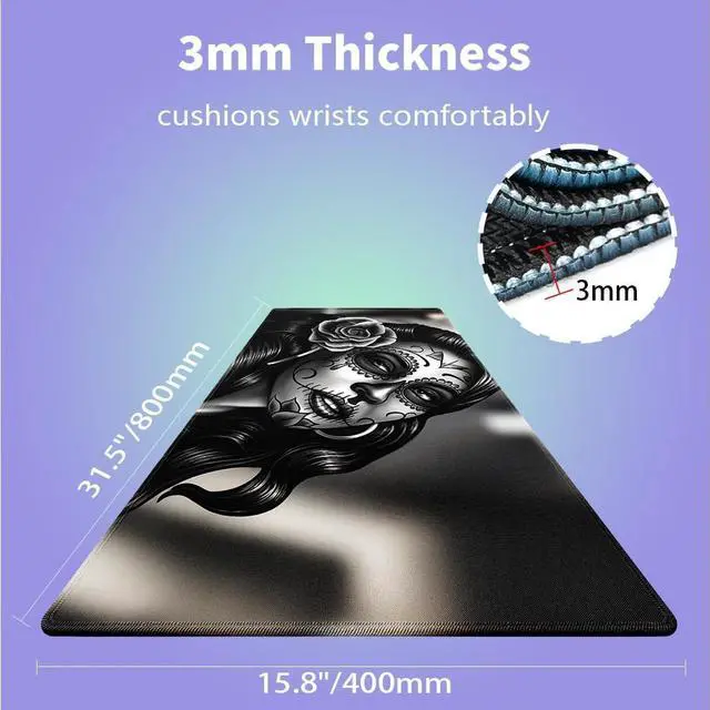 Ultra-Large Size ( 31.5" x 15.8" )Perfect for gaming setups or workspaces, covering your desk and providing ample room for keyboard, mouse, and accessories. ^^ 3mm Thick & ComfortableCushioned thickness ergonomic wrist support reduces fatigue during extended computer sessions, smooth fabric surface reduces wrist strain. ^^ Natural Non-slip Rubber BaseEco-friendly anti-slip grip keeps mat firmly in place during intense use. ^^ Ultra-Smooth Fabric SurfaceOptimized fabric surface ensures precise mouse tracking & low friction for both work and speed gaming. ^^ Stitched Edges for DurabilityExtra-large desk mat with premium stitched edges to prevent fraying, it's a long-lasting gaming mouse pad/desk mat.