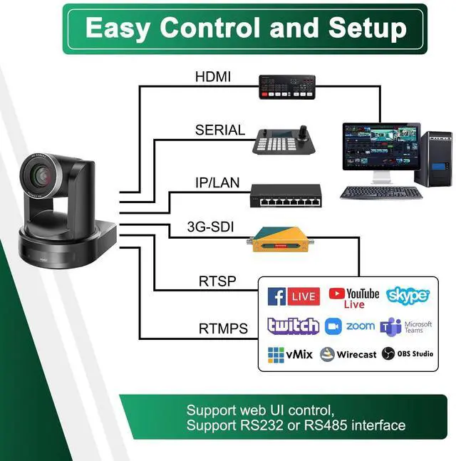 4KP30 ultra-high definition HDMI video outputSupports 4KP30/25, 1080P60/50/30/25, 720P60/50 and other high-definition video formats. 4KP30 ultra-high definition USB 3.0 video outputSupports 4KP30/25, 1080P30/25, 720P30/25 and other high-definition video formats. 1080P60 high-definition 3G-SDI video outputSupports multiple high-definition video formats such as 1080P60/50/30/25, 720P60/50, etc. 255 preset positions255 positions can be preset through the serial port, including pan, tilt, and zoom presets. The preset data can be saved even when the camera is powered off. Multi-function remote controlIt is equipped with an easy-to-operate remote control. In addition to basic settings and control of pan, tilt, zoom, etc.