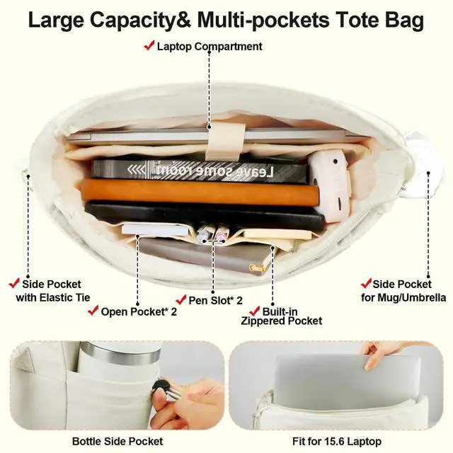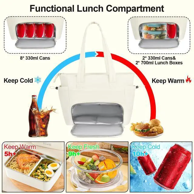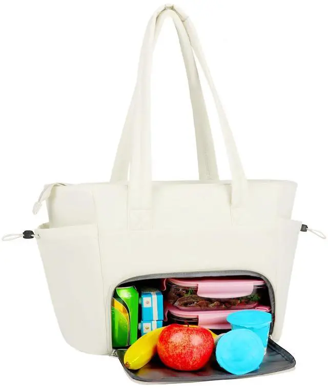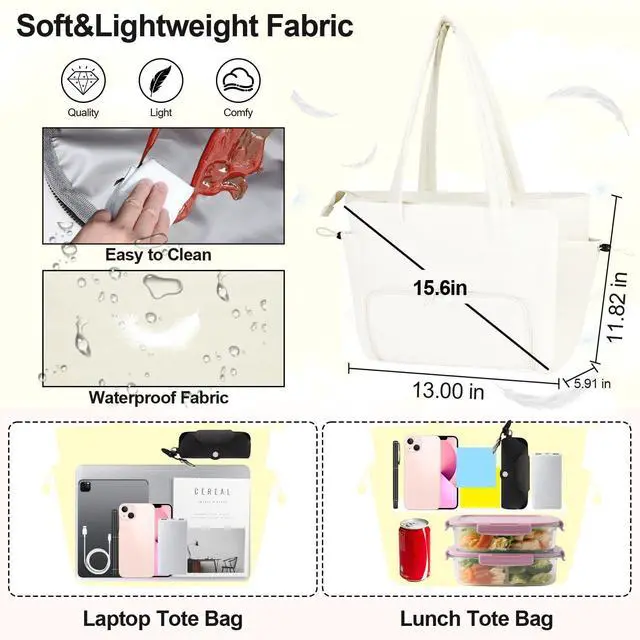 Not only can easily hold the food and fruit, but it also large enough to hold your 15.6 inch laptop, tablet, charger, notebook and stationery. Side pocket with elastic strap is perfect for mug or umbrella storage. ^^ Stylish& Portable Carrying WaysWith soft and comfortable long handles, this work tote bag for women can be carried on hand, arm or shoulder, or secured to your suitcase by the luggage strap when traveling. Its lightweight but sturdy design makes it ideal as a professional work tote or daily bag. ^^ Versatile and Gift-WorthyVeirdro work large tote bag for women with lunch compartment can be used as a work bag, laptop bag, gym bag, beach tote bag, casual shoulder bag, or travel bag.