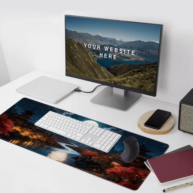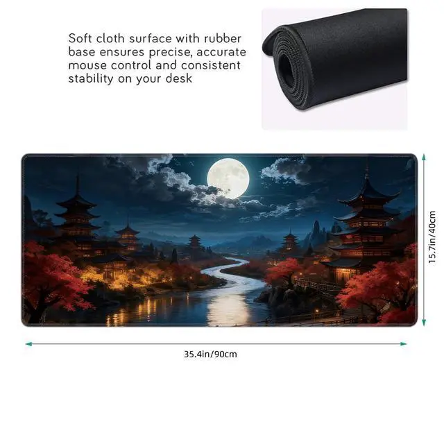 Japanese Riverside Full Moon Large Mouse Pad, Gaming Desk Mat, XXL Extended Keyboard Desk Pad, 35.4"x15.7" Non-Slip Rubber Base Big Mousepad with Stitched Edges for Home and Office