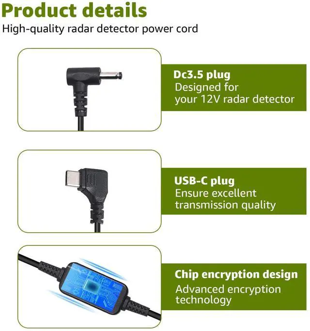 Universal Compatibility AssuranceCompatible with a wide array of radar detectors, including the Cobra RAD series (350/380/450/480i/XRS), Uniden DFR series, Whistler, Radenso Pro M, and other DC 3.5 plug models, the Mondge cable guarantees a flawless connection (Note: Not compatible with Valentine One. ) ^^ Advanced Encryption Technology for Secure Power SupplyEquipped with cutting-edge chip encryption technology, this Type-C to DC 3.5 plug radar detector straight cable supports multiple fast charging protocols (PPS, PD 3.0, PD 2.0, etc. ), ensuring a stable and efficient power supply to your 12V radar detector ^^ Enhanced Travel SafetySpecifically designed for 12V radar detectors, the Mondge power cable seamlessly integrates with cigarette lighters, car chargers, and AC adapters, providing you with a safe and hassle-free driving experience ^^ Premium Construction for Optimal PerformanceCrafted using high-quality 26 gauge copper wire ( 3.5 mm diameter), this cable minimizes current loss and maximizes charging efficiency. It ensures superior transmission quality while shielding against external interference, guaranteeing reliable performance ^^ Extra-Long Length for Versatile InstallationWith a generous length of 6.56F t, the Mondge radar detector cable offers ample reach to fit perfectly into various installation positions within your vehicle. The spring cable design also contributes to a comfortable and tidy driving environment inside your car.