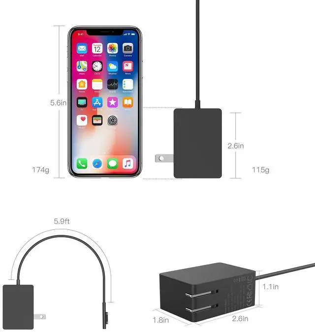 Compatible with Microsoft Surface Go, Surface Go 3/2/1, Surface Pro 6, Surface Pro 5, Surface Pro 4, Surface Pro 3, Surface Pro X, Surface Laptop 1/2/3, Charging Cable ^^ Replacement for AYNEFF Surface Go Charger, 24w Wall Power Supply, Puickly recharges the battery and at the same time DC cable has enough length of 5.9 ft to reach the remote power socket ^^