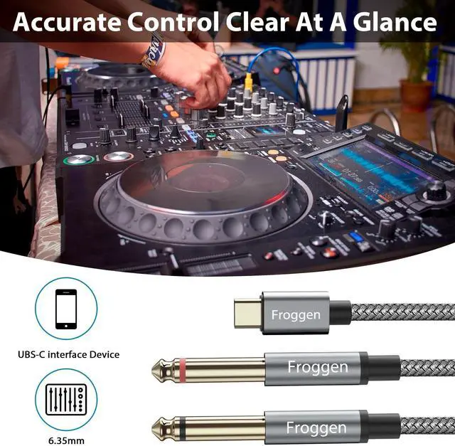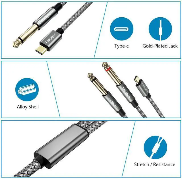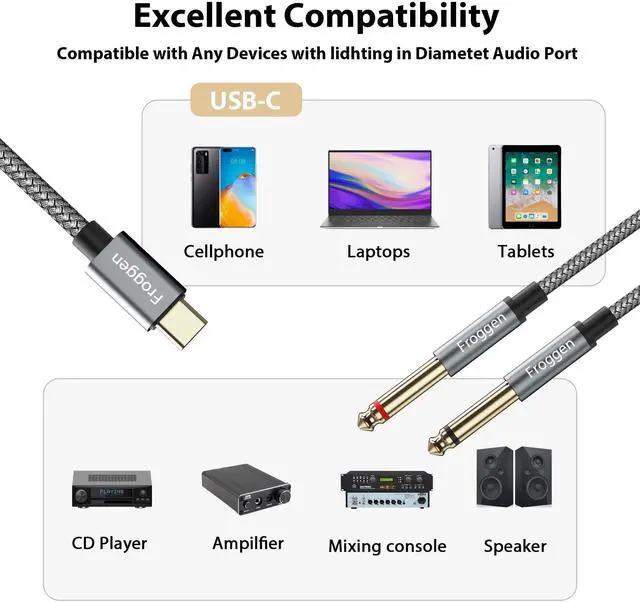 USB Type C to Dual 1/4" TS Mono Y Cable Audio CableUSB Type C Jack to 2x 1/4" Mono Jack audio cable allows you connect most iPads, Tablets or laptop to headphone/speaker/mixers with standard 1/4"inputsGold Plated USB Type C to 6.35 mm 1/4" TS Mono Y-Cable Splitter Cord is perfect for connecting your laptop with a jack speaker output to a device with 2 x 6.35 mm jack inputs - e. g. mixing desk. The jack is easily plugged into the phone. You do not need to remove the case of your phone/tablet. Compatible with iPad, laptops, smartphones and all other audio devices with a USB Type-C output port.