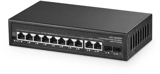 12 Gigabit Ports Includes 8 x 1 Gigabit POE ports, 2 Gigabit Uplink Ports(not PoE), 2 Gigabit SFP, all ports support 10/100/1000Mbps rate. The total bandwidth is 22Gbps, and each port can achieve gigabit rate