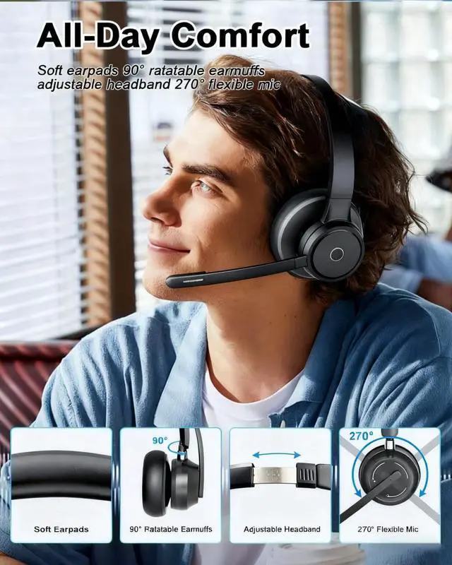All-Day Comfort: Equipped with soft ear cushions and adjustable headband, BlueAir wireless headset for work offers all-day comfort. The 270 swivel mic works on either ear and adjusts easily for clear calls. MFB button lets you answer or hang up calls on mobile phones effortlessly (Only for Mobile Phones) ^^ Dual