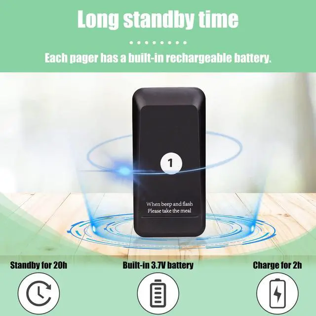 Switchable alarm modes; Retekess TD157 restaurant buzzer has 2 alarm modes; flash + buzzer; flash only; but no vibration mode; you can switch the mode you need ^^ Can share the buzzers with retekess TD157S; if you have a strong demand for vibration mode; you can buy it together with pager system for TD157S; the beepers of the two products can be shared; meet your diversified functions of vibration + flash + buzzer on two hosts at the same time ^^ Easy to set up and program; Retekess TD157 restaurant pager system no need to reprogram; the dining car restaurant pager buzzer is easy to use out of the box ^^ Long standby time; Retekess TD157 restaurant pager system can work for 20 hours after charging; avoid the trouble of frequent battery replacement; meet the needs of long-term use ^^ Adjustable reminder time; the food ready buzzer can set the buzzer duration to 1-99 seconds; the restaurant pager will not keep beeping