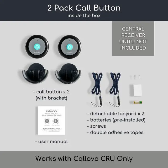 PORTABLE ACCESSORY FOR CALLOVO CALL SYSTEM: Callovo nurse call button (2-Pack) is compact and portable that can be installed in multiple user settings including clinic, restaurant, nursing home, assisted living, nurses station, emergency room, call desk, church, hospital, physical therapy, wellness center and more.