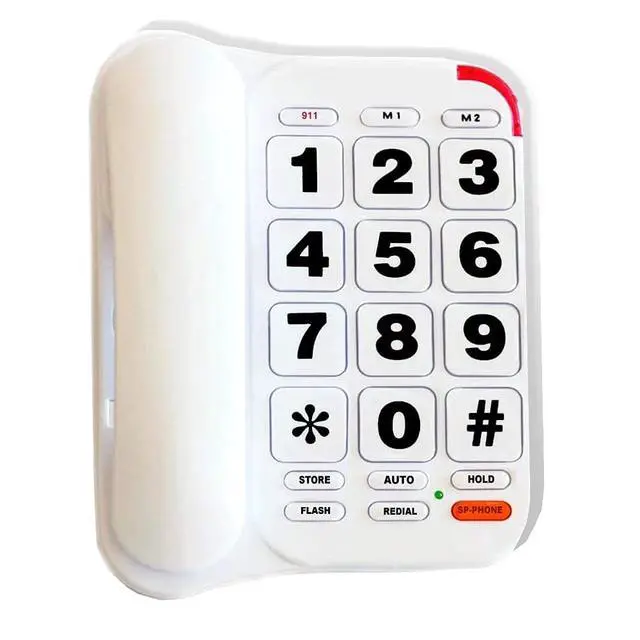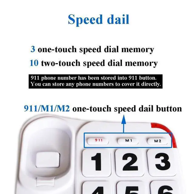 Big Button-Size: W 1.0 inch * L 1.0 inch. It is easy to see and press for seniors or people who are low vision ^^ Amplified and Adjustable Volume-The big button phone for seniors has built in speaker IC to amplify the volume, the volume can up to 40 db. And the volume of receiver, speakerphone and ringer are adjustable, the ringer can be turned off ^^ Speed Dial Memory&Stored Memories Protection-The large button phone with 3 one-touch and 10 two-touch speed dial memory. And you dont need to worry about the loss of stored memories. Even if the phone line was unplugged, the stored memories will not disappear. It will help people to contact others in emergency more quickly, especial for elderly ^^ Wall Mountable and Desktop-Wall mount part makes the installation easier. Four enhanced nonskid plastic part can prevent the phone slipping from the desk. The distance between 2 holes is from 3 to 3.8, please confirm the distance in your wall mount plate before placing an order ^^ Big button phone designs for seniors who are dementia, hearing impaired and low vision, etc.