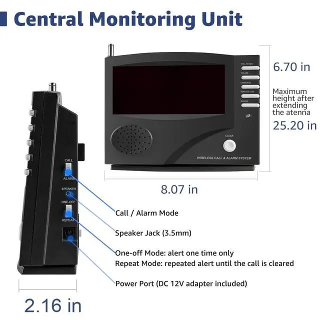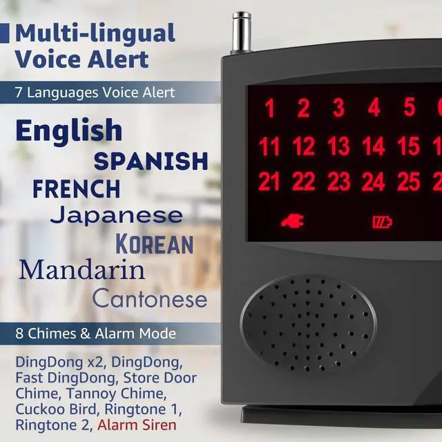 ^^ PORTABLE AND FLEXIBLE: It is applicable for various environments such as clinic, restaurant, care facilities, wellness center, assisted living, warehouse, hospital, construction sites and many more. ^^ All functional buttons are front facing, which simplifies the set up of this caregiver/nurse call system no matter if it is installed on a wall or placed on a desk. Plug the paging system to power socket with AC adapter provided to power and keep 4 C type batteries aside as a backup. ^^ Extra call buttons, motion sensor, portable caregiver pager with LCD and other configuration are available purchase upon request separately.