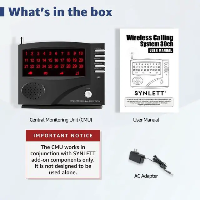 The SYNLETT wireless central monitoring unit receiver ONLY must be paired with SYNLETT components to function. ^^ Compatible with SYNLETT standard call button, 2-in-1 Dual Function Call Button, Call Reset Button and Portable Caregiver Pager QM003 with LCD display.