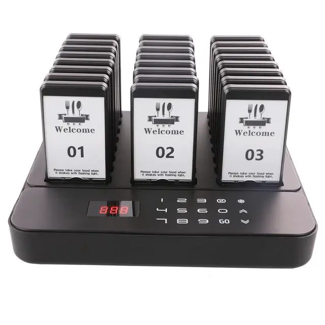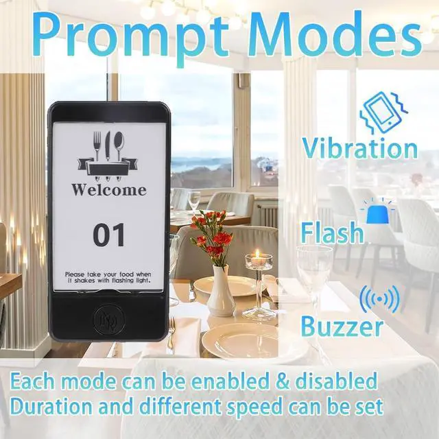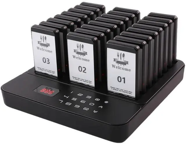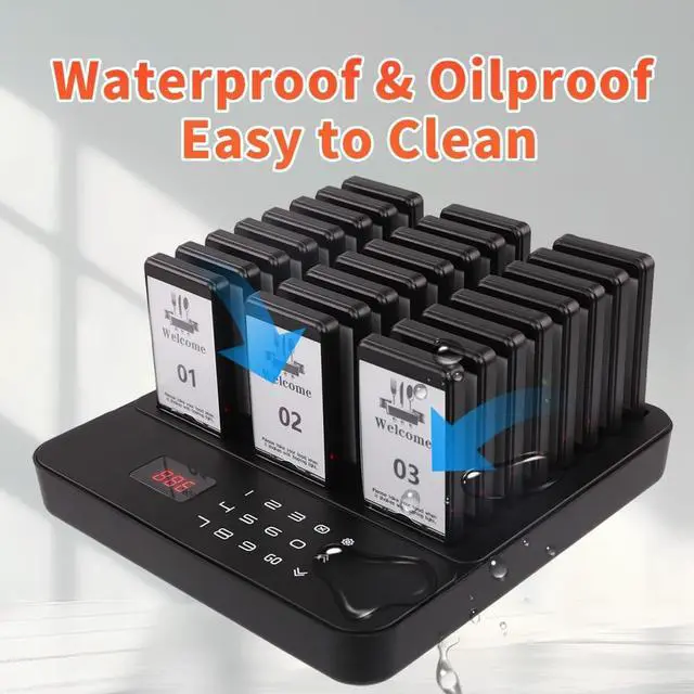 1000FT LONG RANGE - Experience unparalleled coverage with a robust range of up to 1000 feet in open areas, ensuring customers can be reached even in large spaces or while waiting in their cars. ^^ 3 BASIC ALERTS & 7 CUSTOM MODES- Enjoy ultimate flexibility with 3 distinct alert types: Vibration, Flash, and Buzzer. You can independently enable or disable each one, creating 7 customizable combinations. This allows you to tailor the notification for any environment, from a quiet clinic to a noisy food court. ^^ INSTANT MUTE BUTTON- Allows customers to discreetly silence alerts with a single press, preventing prolonged buzzing from disturbing others and ensuring a peaceful environment. ^^ INSTANT BRAND CUSTOMIZATION- Easily design and swap in your own ads or logo. Keep your marketing fresh and perfectly match your restaurant's style, turning every pager into a mobile billboard. ^^ RECHARGEABLE BATTERY & STACKED CHARGING- Say goodbye to constant battery replacements. Each pager has a built-in rechargeable battery, providing up to 20 hours of continuous use on a full charge. The space-saving stacked charging design allows all 24 pagers to charge neatly in one base. ^^ TOUCH KEYBOARD & ONE-TOUCH GROUP SHUTDOWN- Features a modern touch-sensitive keyboard for quick and easy operation. Save time at closing with the innovative group shutdown: simply enter "999" and press CALL to instantly power off all pagers on the charging base simultaneously. ^^ CUSTOMER-FOCUSED & MULTI-SCENE USE- Enhance customer experience by eliminating crowded queues. The mute button allows users to discreetly silence alerts. With customizable logo stickers, it's the ideal wireless solution for restaurants, food trucks, hotels, clinics, churches, and inventory management.