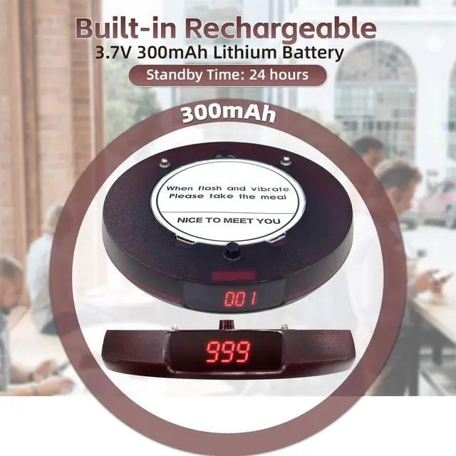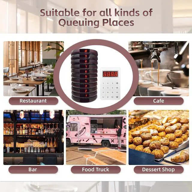 LONG RANGE Our 20-buzzer restaurant pager system delivers 1, 300 ft (400m) open-area range, with reliable performance through walls in typical restaurant environments. The scalable system supports expansion up to 999 pagers ^^ 3 NOTIFICATION MODES The beepers for restaurants use vibration, light, and sound alerts to ensure they're noticeable even in noisy environments. ^^ VERSATILE & PRACTICAL Perfect for restaurants, cafes, food trucks, clinics, churches, and more. Simplifies order management and improves customer flow. ^^ EASY TO USE These restaurant buzzers feature true plug-and-play operationsimply type the number to call, and the pager instantly responds.