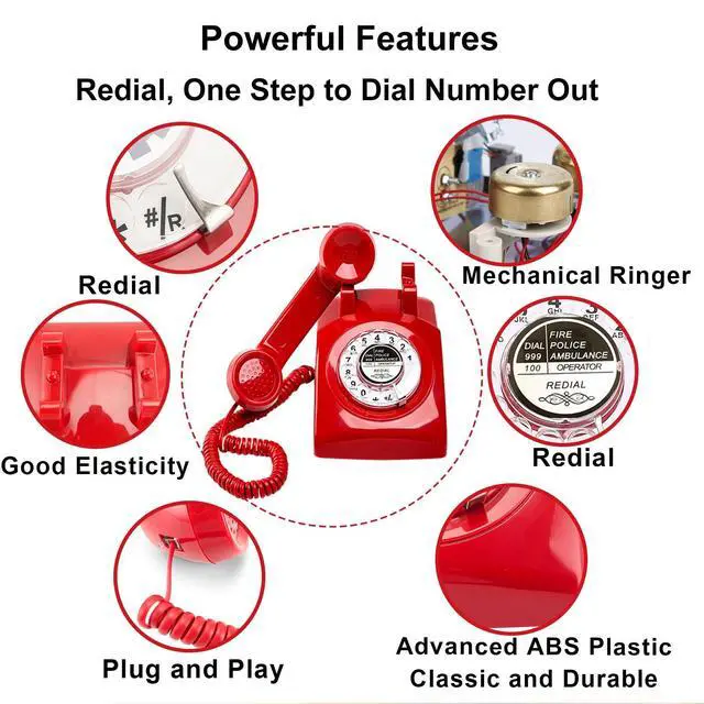 Instant Nostalgia, Classic Retro Design & Durable ConstructionThe red retro phone with rotary keypad popular from 1960s, captures the nostalgic charm of yesteryear with sturdy ABS materials. This antique rotary landline telephone is built to withstand regular use. One of the special feature is the color of the old style phones curly cord is SAME as the phone body! ^^ Plug and Play, Strong