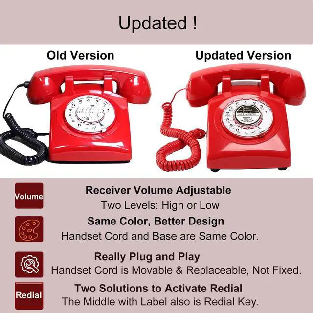 Compatibility: The red old fashioned rotary landline telephone is well compatible with modern landline telephone systems, allowing you to blend the past with the present. We improve the handset cord, both of the ends are Movable, which is very easy to change it, Without changing the handset together. ^^ Bat Phone & Backup Emergency Phone: You can have your own Red Bat Phone. The color is the classic RED. This analog rotary dial phone only needs the landline telephone line. No Battery, No AC Power, No External Power, it will work once connected the telephone line. So its also a Backup Emergency Phone when there is no power during special weather or when the the cell phone is power off. ^^ Mechanical Ringtone, Redial