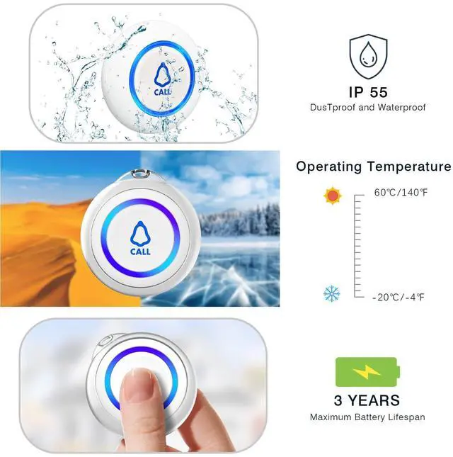 Immediate Assistance Whether you're a senior at home or a patient in the hospital, help is just a button press away. Its convenience and safety bring peace of mind to your life. ^^ Reliable Performance With a wireless Operation range of 1500 feet in open area, waterproof and dustproof design, and an operating range from -4F to 140F, it ensures reliable performance in various environments. ^^ Long-lasting Battery Powered by a CR2032 battery, the call button offers up to 3 years of continuous use, minimizing maintenance and ensuring uninterrupted service.