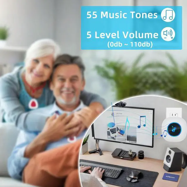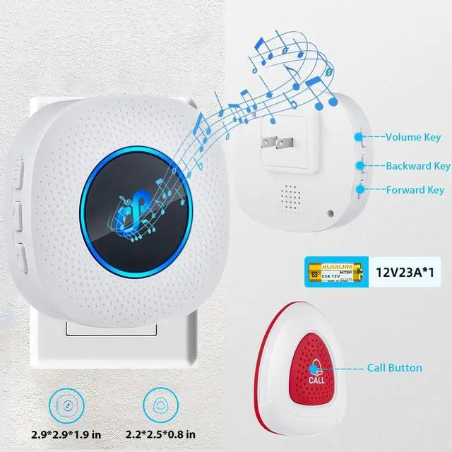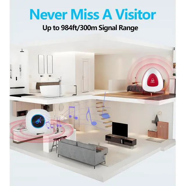 Wireless Caregiver PagerWith just the touch of a button, the alert is sent directly to the receiver, and caregivers and residents can get help. ^^ Music and VolumeThe wireless caregiver pager has 55 ringtones for you to choose from. The volume can be adjusted between 5 levels from 0 dB to 110 dB. IP65 waterproof call button, no need to worry about getting wet. ^^ Wide Reception RangeExtremely long reception range of 984 feet/300 meters (open area), and it is expandable. It is suitable for two-story or three-story homes. It can also be paired with other receivers or call buttons to expand your range of use.