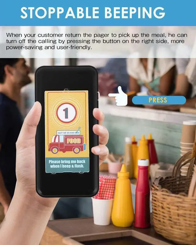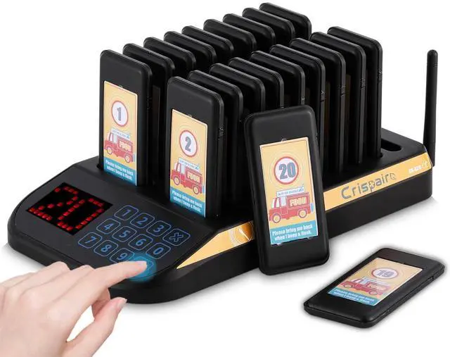 Please note that actual transmission distances may vary slightly depending on wall materials. This ensures reliable communication across various layouts and environments, from small cafes to large banquet halls. ^^ Two Customizable Alert Modes Choose between two customizable alert modes: 1) Buzzer + Flash + Vibration; 2) Flash + Vibration. Our wireless calling system also features a vibration-only mode, ideal for solemn occasions where discretion is key. These options allow you to tailor notifications to meet your specific needs in different settings. ^^ Stoppable Beeping When customers return their pagers to pick up their meals, they can easily turn off the beeping by pressing the button on the right side of the device. This feature not only conserves battery life but also enhances user experience by providing a more convenient and customer-friendly option. ^^ Sensitive Touch Screen & Splash-Resistant Design Unlike traditional button-based pager systems, Crispaire adopts a touch-screen interface for more convenient and responsive operation. The splash-resistant design makes it perfect for use in food service environments where spills are common, ensuring durability and reliability.