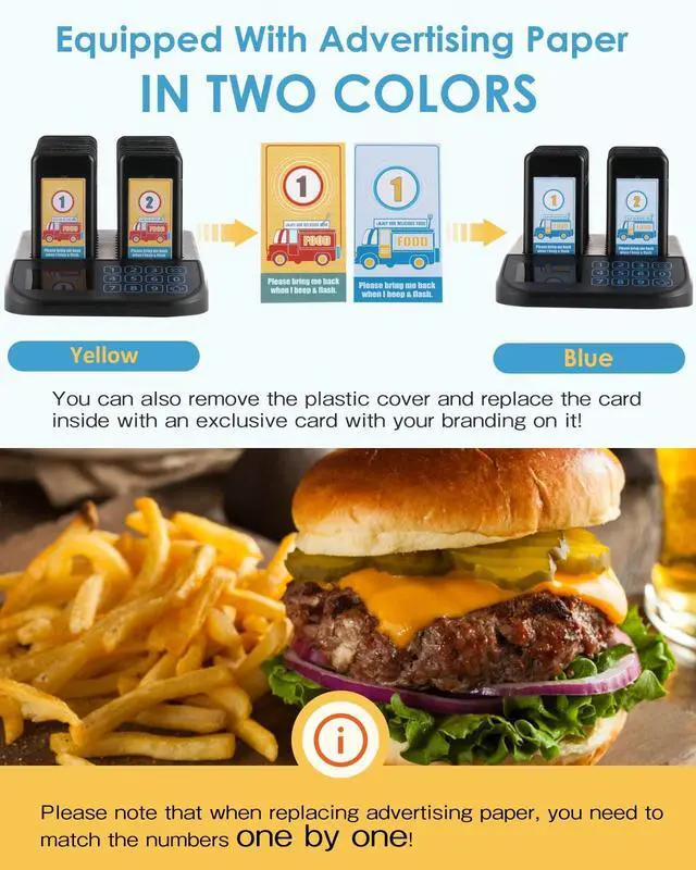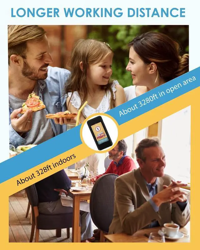 Replaceable Advertising Inserts Please note that due to different delivery batches, some units may require you to replace the advertising inserts in the pagers manually. Simply match and replace them according to the corresponding numbers provided. The package includes two colors of advertising papers for your choice. Additionally, you can easily remove the plastic cover of the restaurant pager and replace the card inside with a custom-branded card, enhancing your brand visibility and professionalism. ^^ Extended Working Range Our restaurant pagers offer an impressive indoor range of up to 328 feet and an outdoor range of up to 3280 feet.